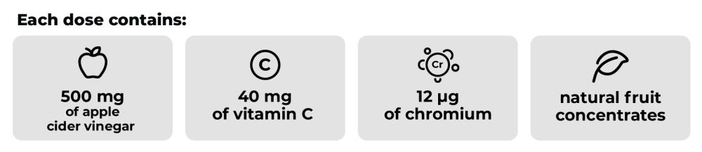 Poudre de vinaigre de cidre, vitamine C (acide L-ascorbique), picolinate de chrome, saccharose, sirop de glucose, eau purifiée, épaississant (pectine), concentré de jus de pomme, concentré de jus de grenade, concentré de cassis, régulateur d'acidité (citrate de sodium), concentré de jus de carotte, arôme naturel, régulateur d'acidité (acide citrique), agents de glaçage (huile de coco, cire de carnauba), concentré de carotte noire.