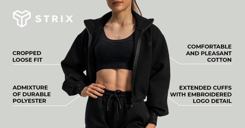 Veste zippée Lunar pour femmes, avec une coupe courte tendance qui ravira grâce à son matière confortable et son look élégant. Elle est confectionnée en coton mélangé à du polyester et de l'élasthanne. Cette combinaison de matériaux non seulement la rend très chaude, mais elle est également extrêmement agréable pour la peau. Elle vous garantira ainsi un confort maximal lorsque vous la portez. Il présente une fermeture zippée pratique, une col montant et deux poches latérales dans lesquelles vous pouvez ranger votre téléphone, vos clés ou d'autres objets de valeur. Il possède également une ceinture élastique, qui contribue à maintenir sa forme. Les manches sont ornées d'un grand logo STRIX, que vous pouvez utiliser pour montrer au monde que vous aussi faites partie de la communauté des passionnés de sport. Elles ont une coupe plus ample et plus courte qui mettra parfaitement en valeur vos abdominaux sculptés.