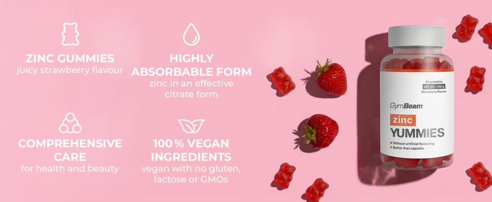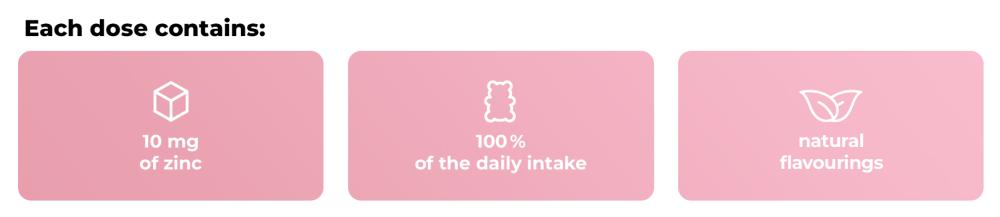 Zinc Yummies sont des bonbons gélifiés à la fraise uniques qui vous aident à atteindre votre apport quotidien optimal en zinc essentiel. Une portion de ces délicieux bonbons fournit **100 %** de l'**apport journalier recommandé** de **10 mg**. Un avantage majeur est la forme de citrate de zinc, qui se distingue par sa biodisponibilité dans l'organisme. De plus, les bonbons gélifiés **ne contiennent pas d'édulcorants artificiels et sont exempts de gluten, de lactose et d'OGM**.